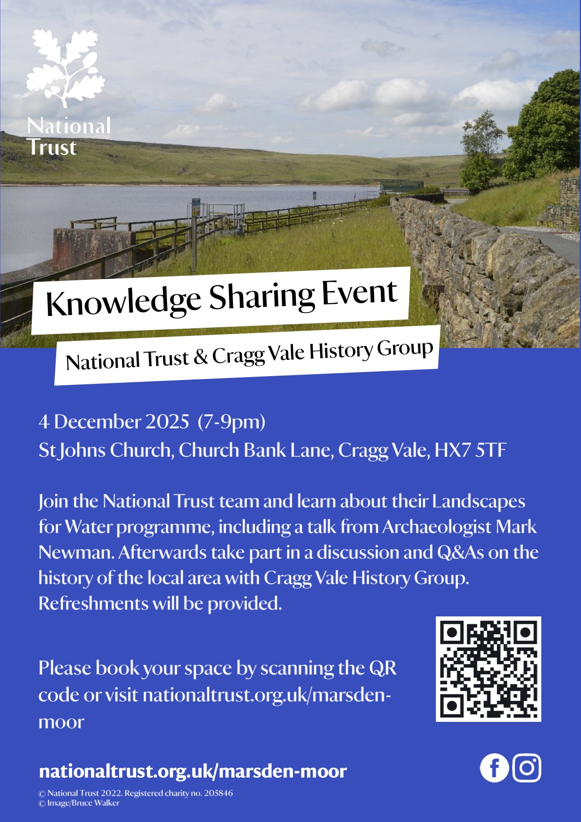 The Knowledge Sharing Event for Cragg Vale is scheduled for Thursday 4th December 2025 from 19:00 – 21:00 at St John's Church, Cragg Vale.